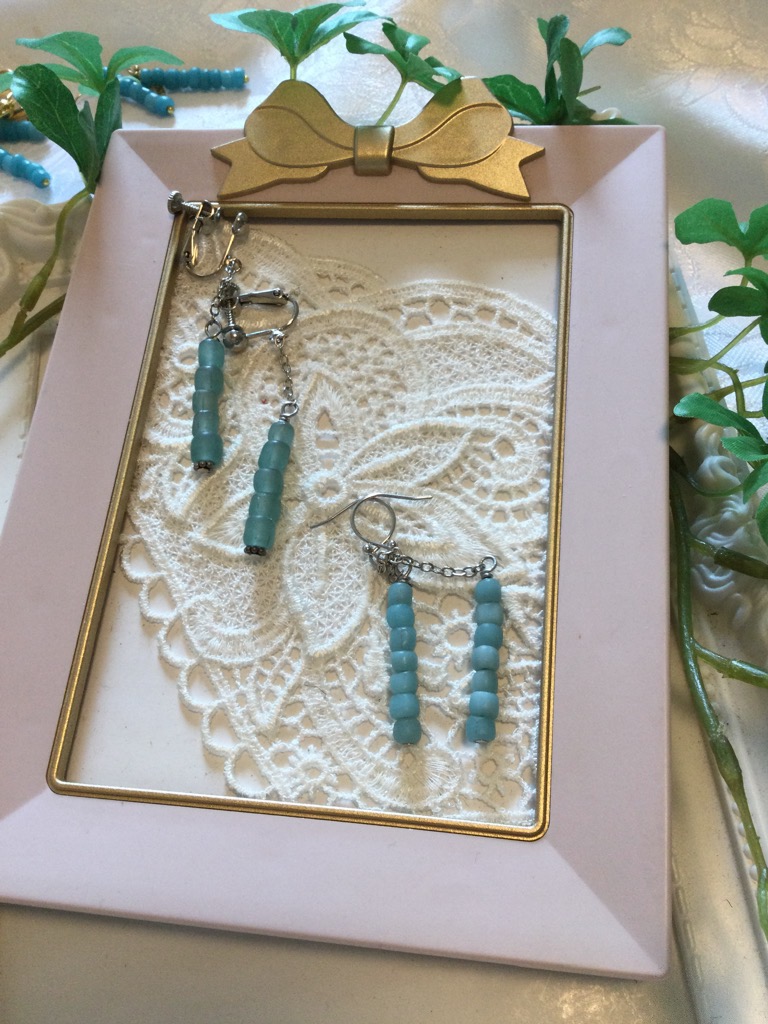 昔からの製法で作られたビーズです。ひとつとして同じ形ではないです。シンプルなイヤリングとピアスを作ってみました。半透明で涼し