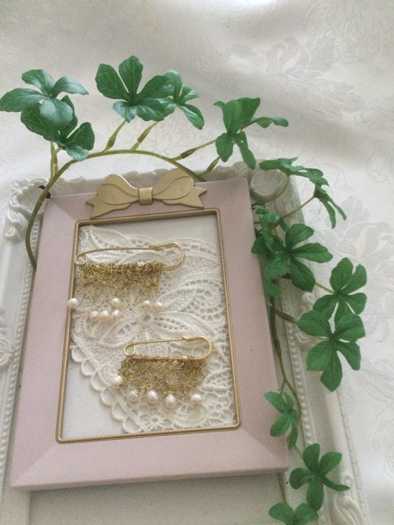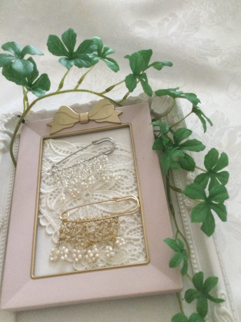 ワイヤー線で淡水パールを編み込みカブトピンに付けてブローチにしてみました。