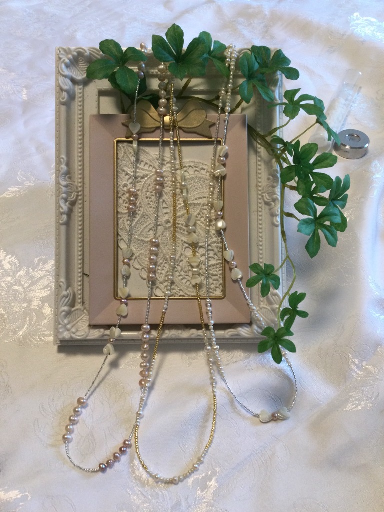 ロングネックレスを淡水パールで作ってみました。間に金具を入れたり、小さいパールで軽くなるようにしました。