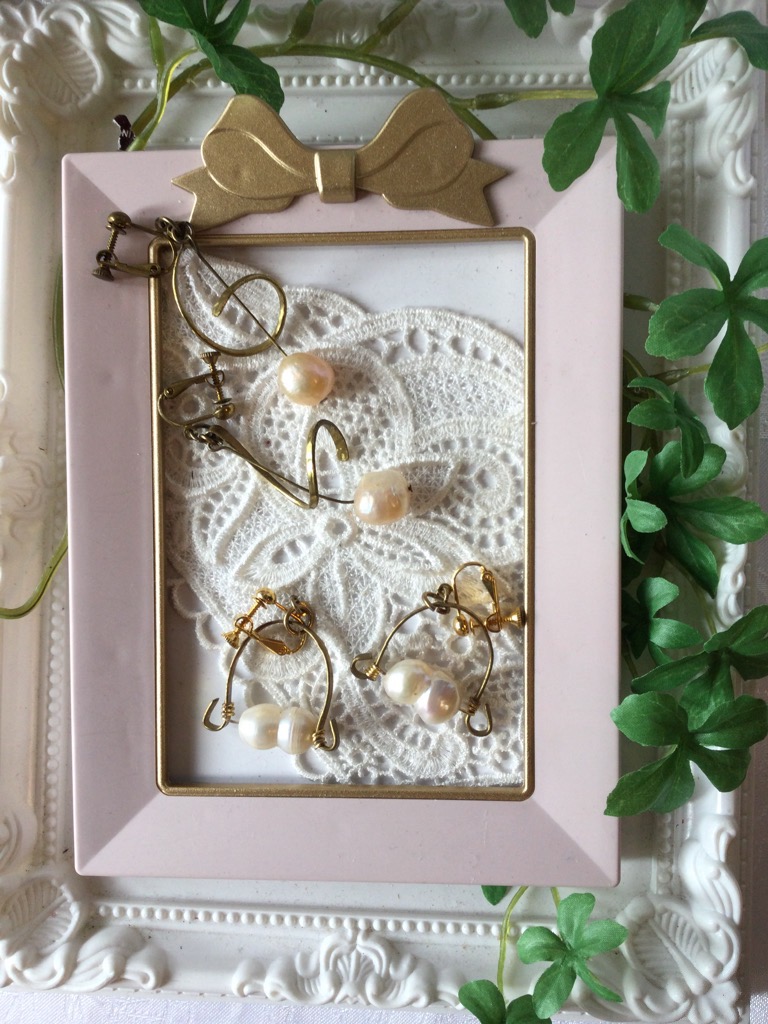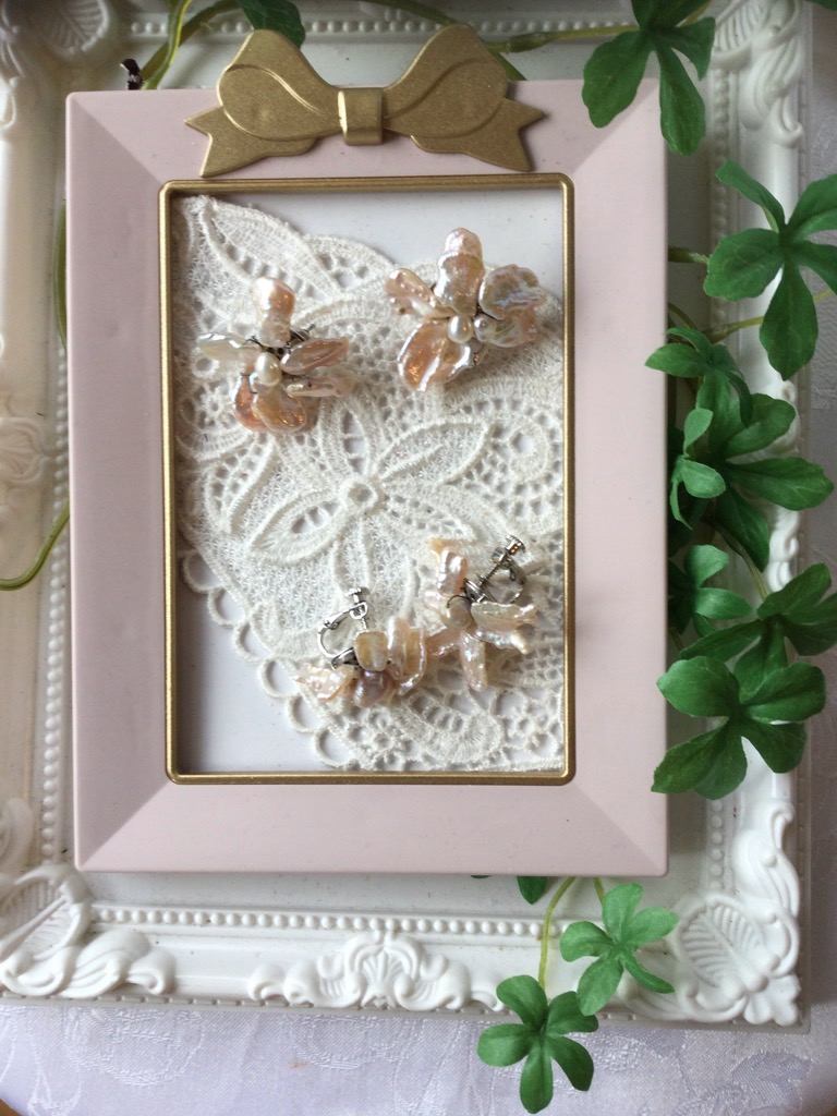平たい形の淡水パールをお花の形にして、イヤリングとピアスを作ってみました。耳に付く形にしてみました。