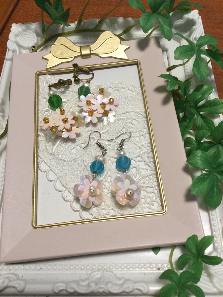 バンコクで仕入れた、花の形のスパンコールで、イヤリングとピアスを作ってみました。大ぶりですがとても軽くてつけやすいです。