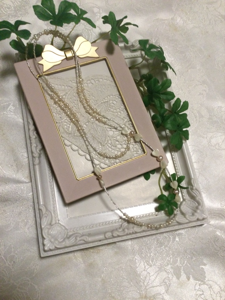 リボン🎀みたいに見えるように、ハートの貝を使って普段使いできるように、短めのネックレス作りました。