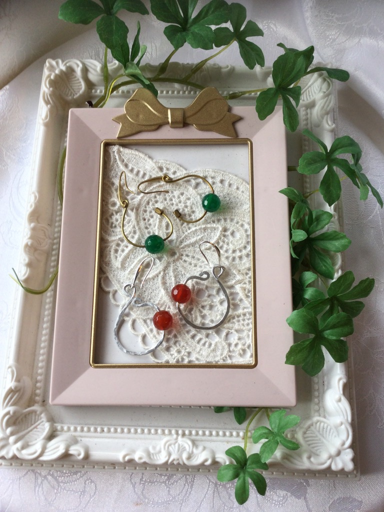 作品はのせていきます。ワイヤー線と天然石、淡水パールを使ってイヤリング、ピアスを作ってみました。ゆらゆら揺れてカワイイです。