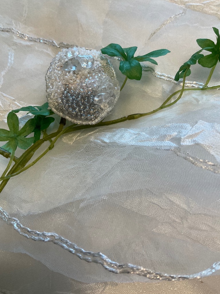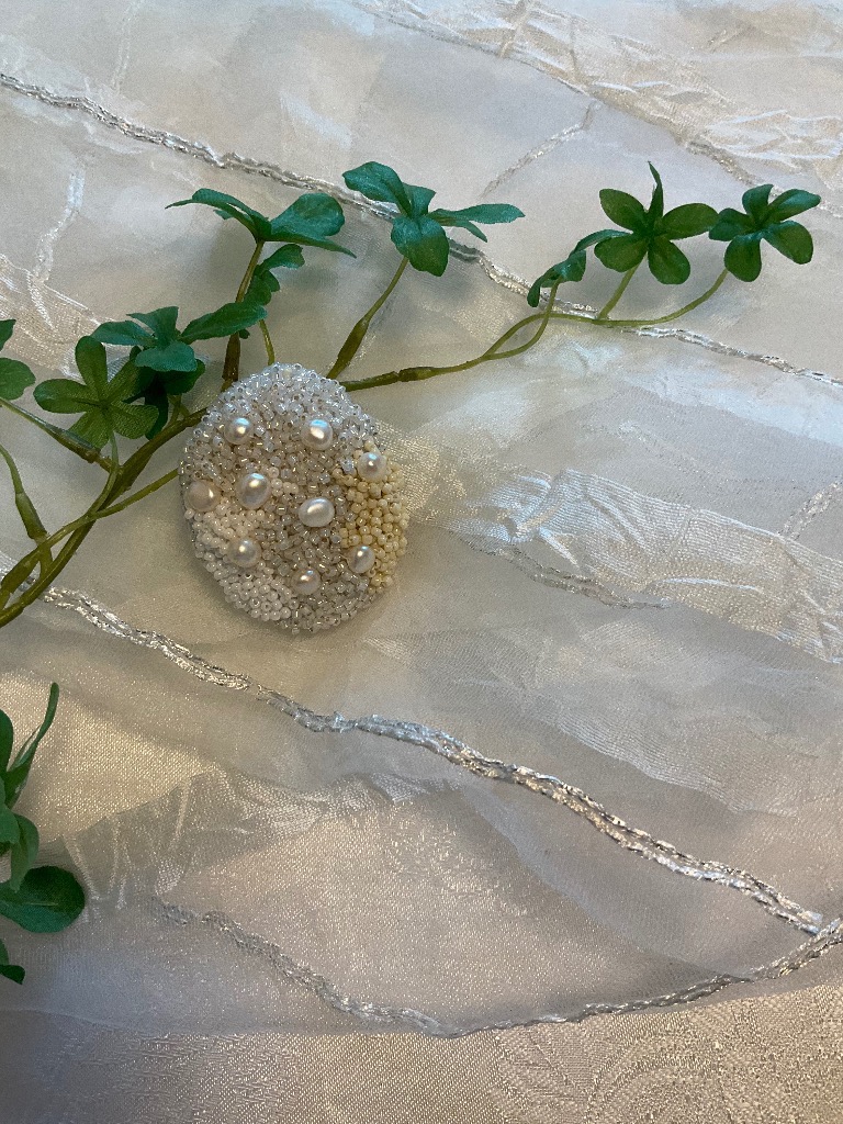 淡水パールとビーズで刺繍してみました。これからの季節に爽やかさを出す軽いマグネットタイプのブローチになります。