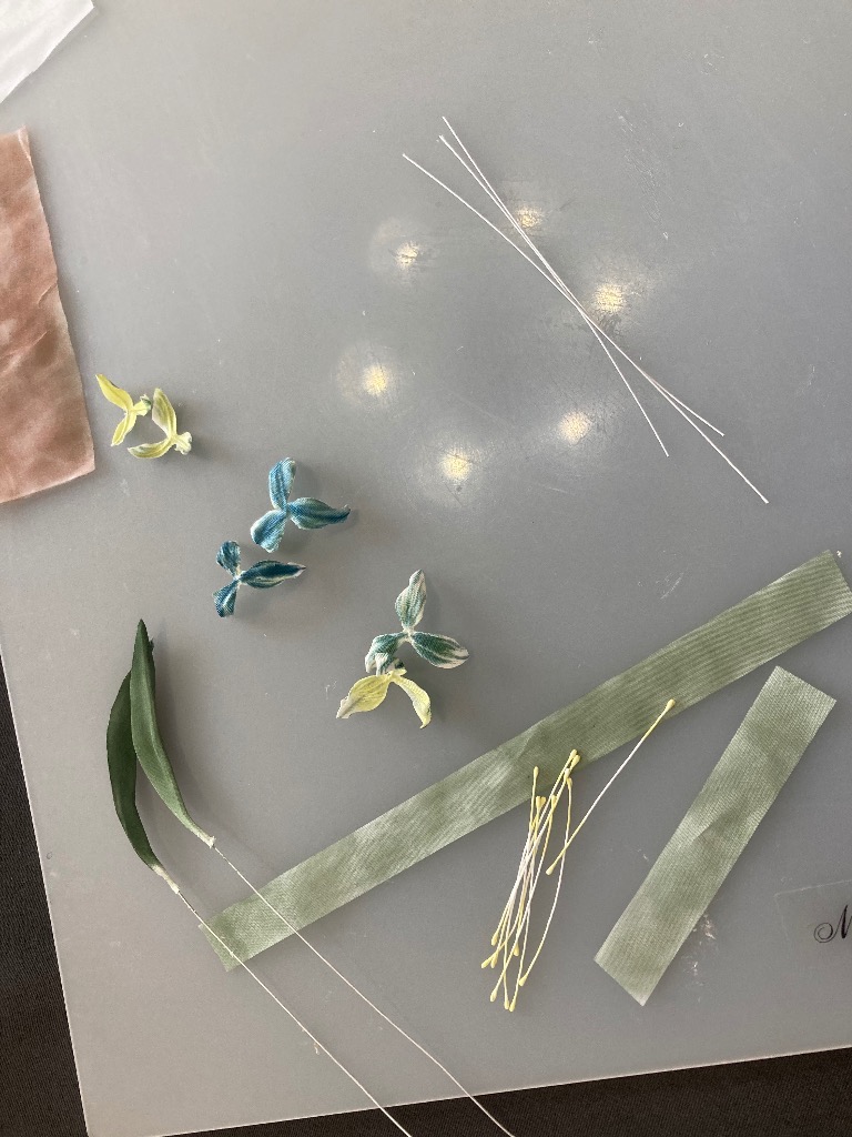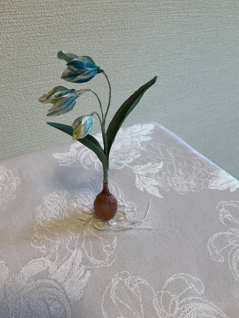 月に一度布花のお稽古に行っています。布を切り、色を付けてからコテで形を整えてから組み立てます。今回初めて球根のチュウリップを作りました。11センチの小さな花なので3時間かかりました。