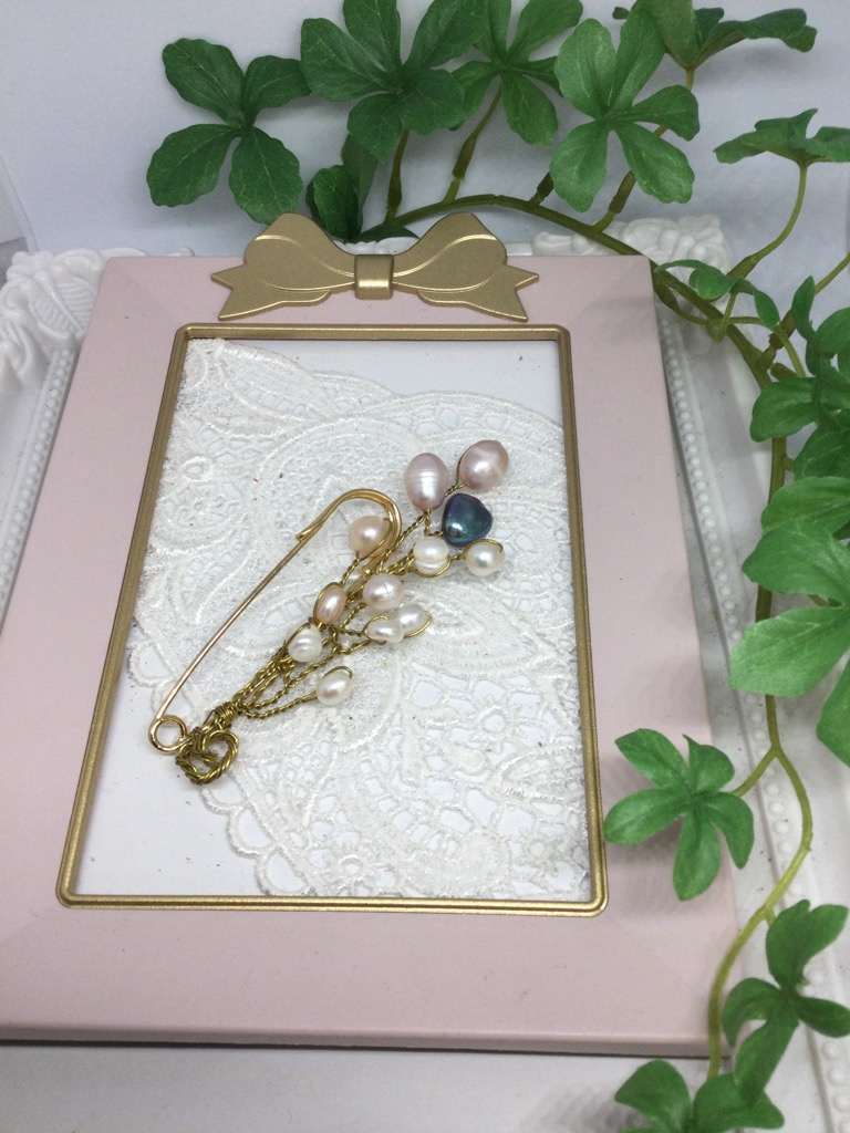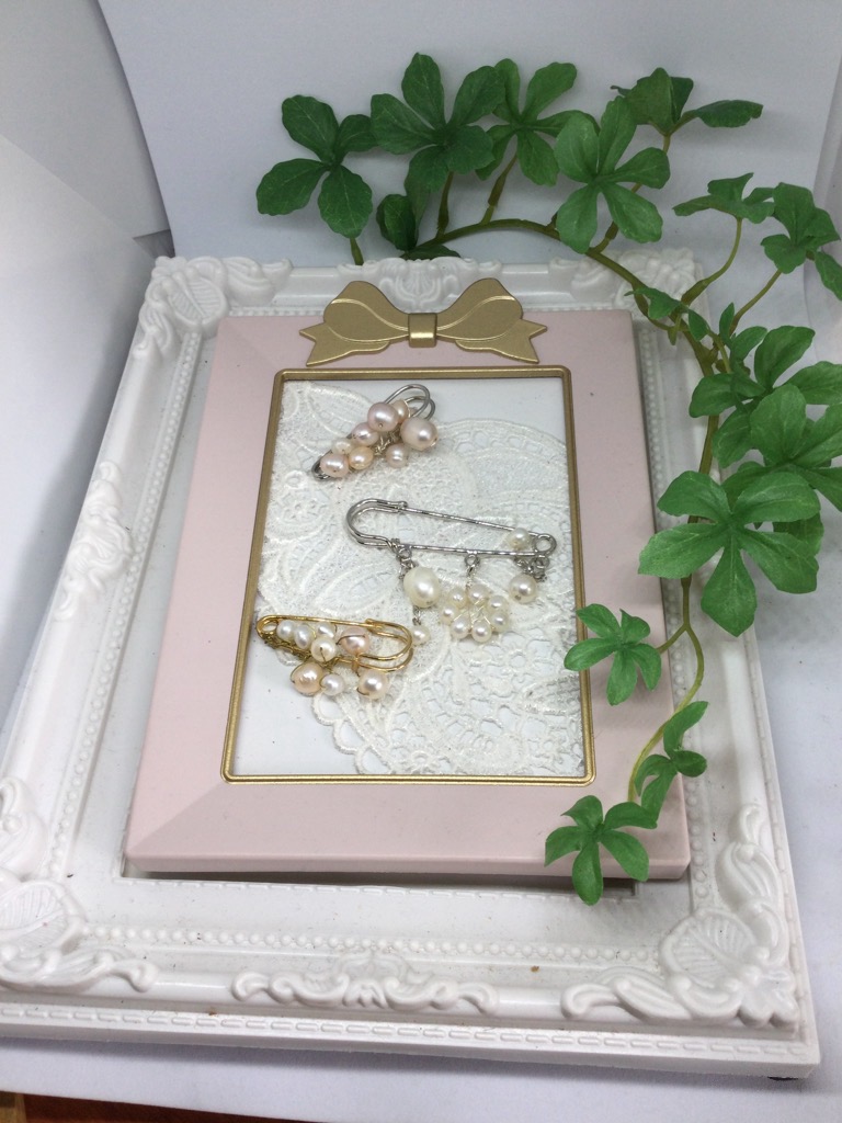 スカーフピン留めに淡水パールを付けていろいろな大きさなブローチを作ってみました。暑い季節帽子にワンポイントにいかがですか?