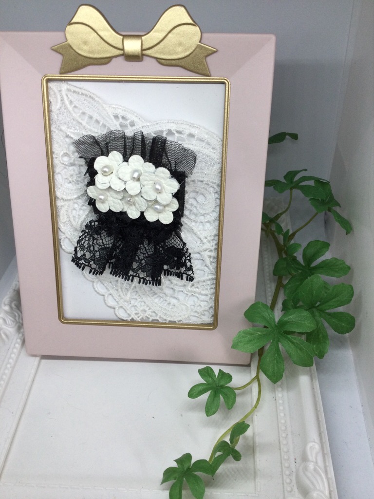 レースと淡水パールを使って、ちょと大きめのブローチを作って、額に入れて飾ってみました。インテリアにもいかがでしょう?
