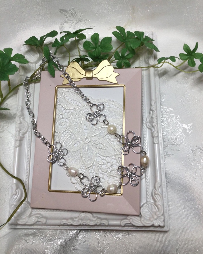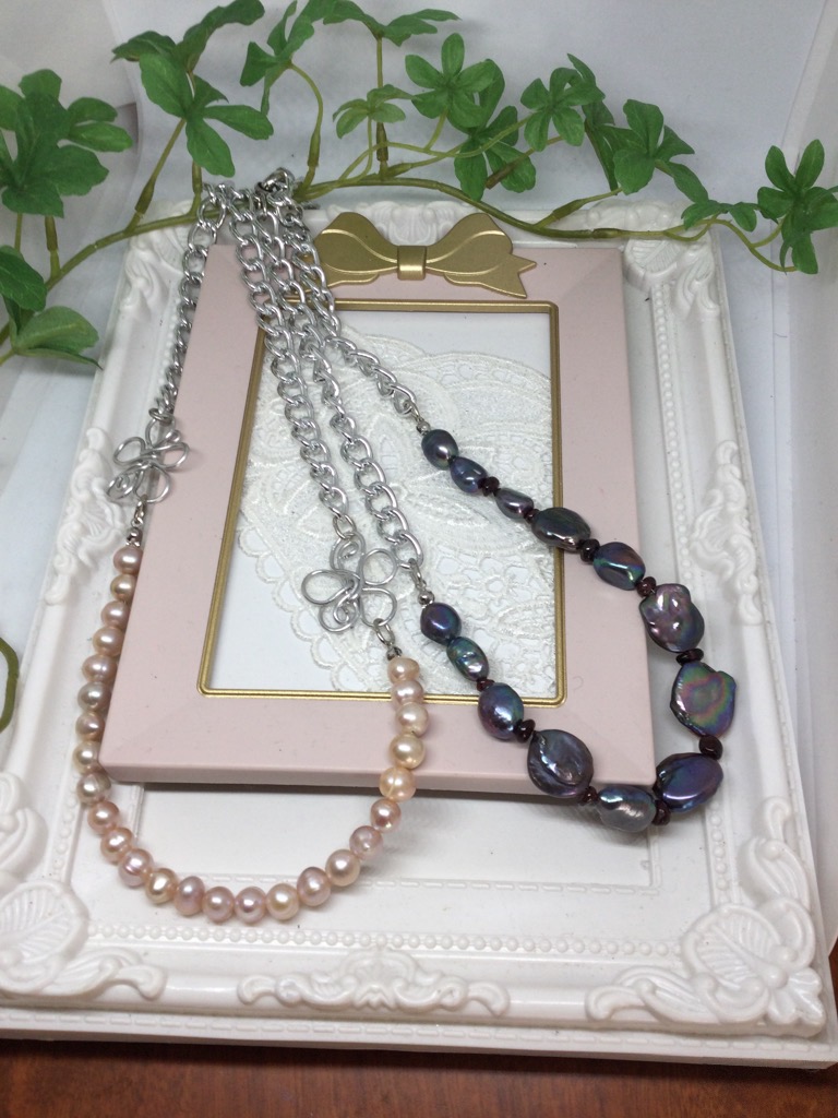 アルミチェーンと淡水パールで軽いネックレスを作ってみました。