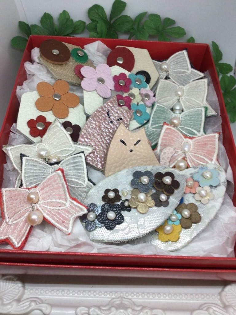 革のブローチをクッキー見たいに、箱に詰めて遊んでみました。