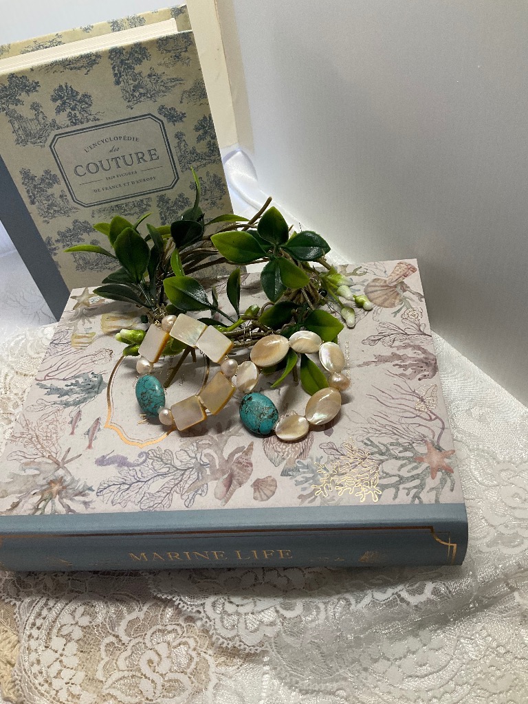 マザーオブパールに本物のターコイズを使ってブローチを作りました。ターコイズが本物なので、存在感があり、これからの季節濃い色にも合うと思います。