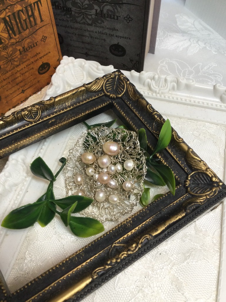 アートスティックワイヤーで淡水パールを編み込みしてブローチを作りました。淡水パールを散りばめているので、普段使いにも最適です。