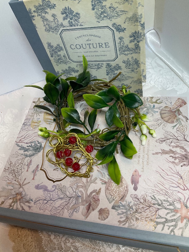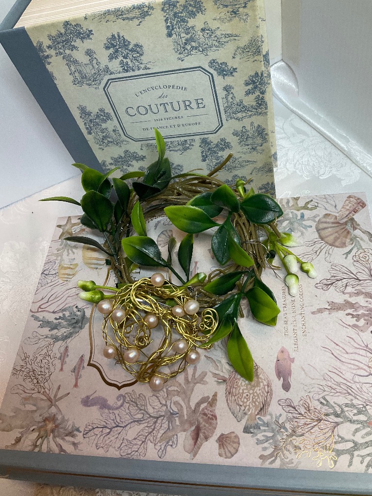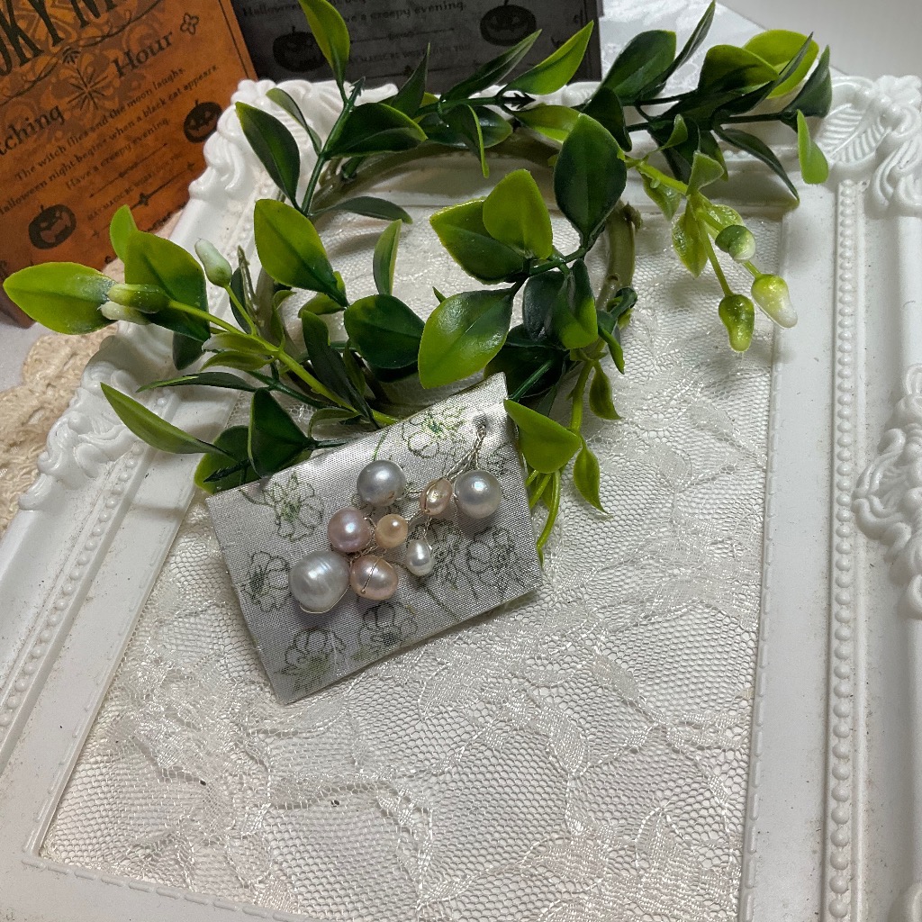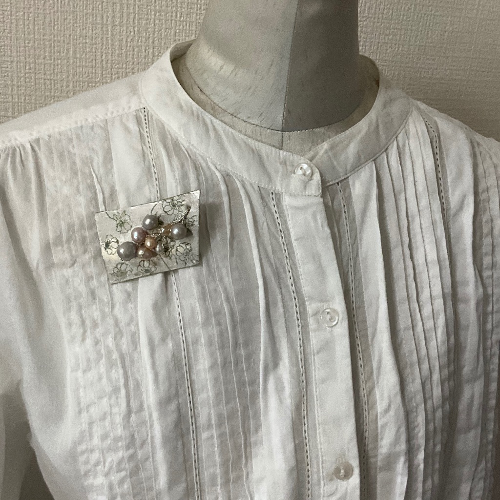 アルミ板にハンコを押して、その上に淡水パールを付けて華やかにしてみました。